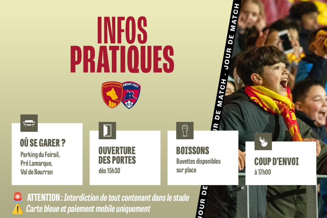 Attention, tous les horaires changent ce samedi ! Les Ruthénois reçoivent le Clermont Foot 63, le 09 mai à 17h ! Découvrez toutes les informations pratiques ci-dessous.